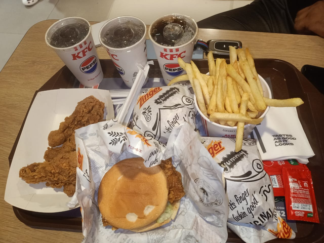 We went to KFC and ordered a deal. This deal included three zinger burgers, three nuggets, some drinks, etc., and ice cream. After ordering this, we reached our table number four, which we had already received, and our order reached us in about 15 minutes.