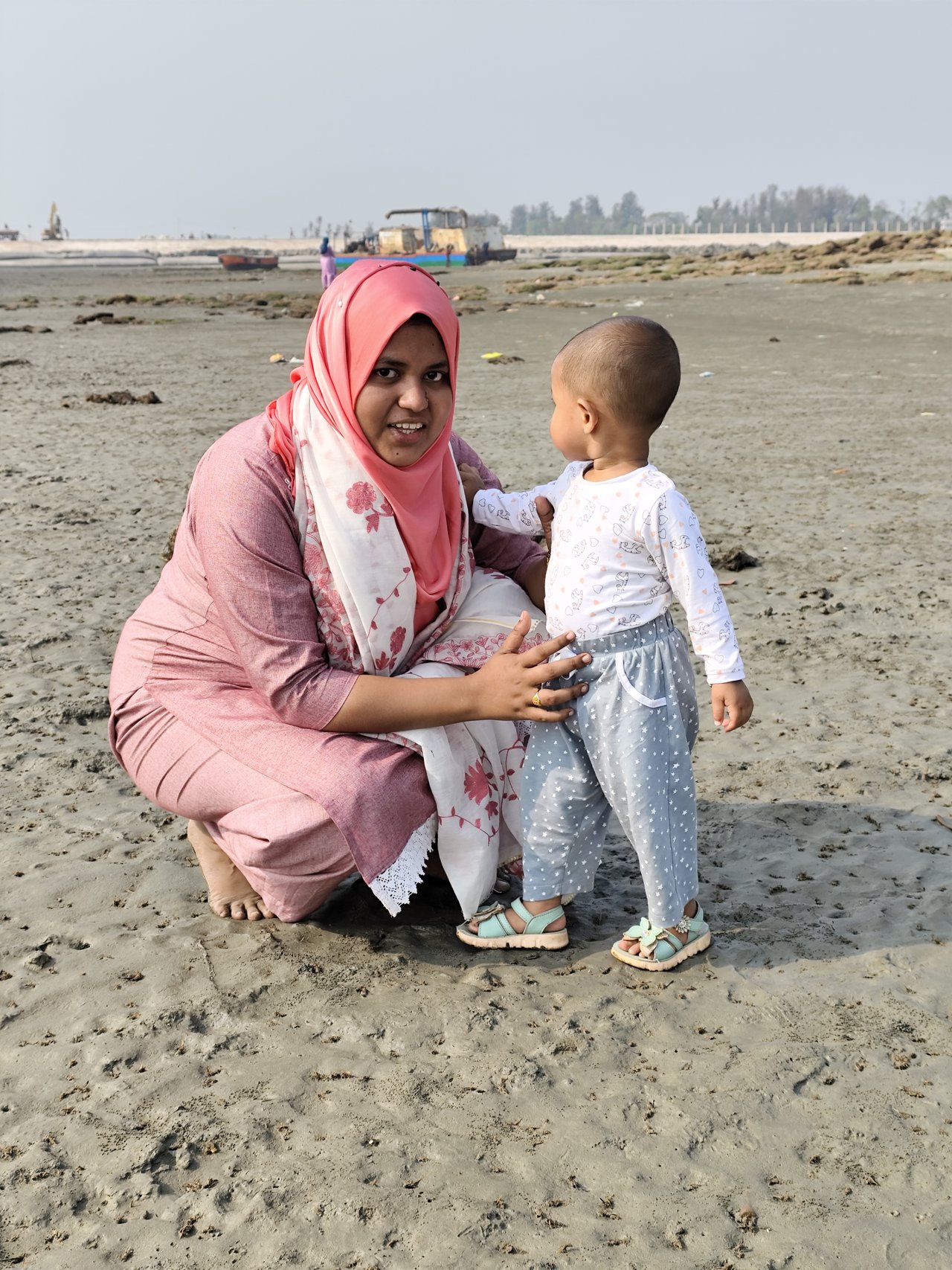 I really enjoyed watching their songs and dances. We all stood there together and enjoyed their songs for a long time. To be honest, I enjoyed their dances and songs a lot. You can come to this place if you want. The surroundings are like a desert, with sea water on one side. Houses on the other side. And there are small gardens of trees. And anyone who comes to these places will feel good. And we came here from Feni Daganbhuiyan to visit. And the day we came here to visit, the whole family rented a micro. And to come here, we first left the house quickly.