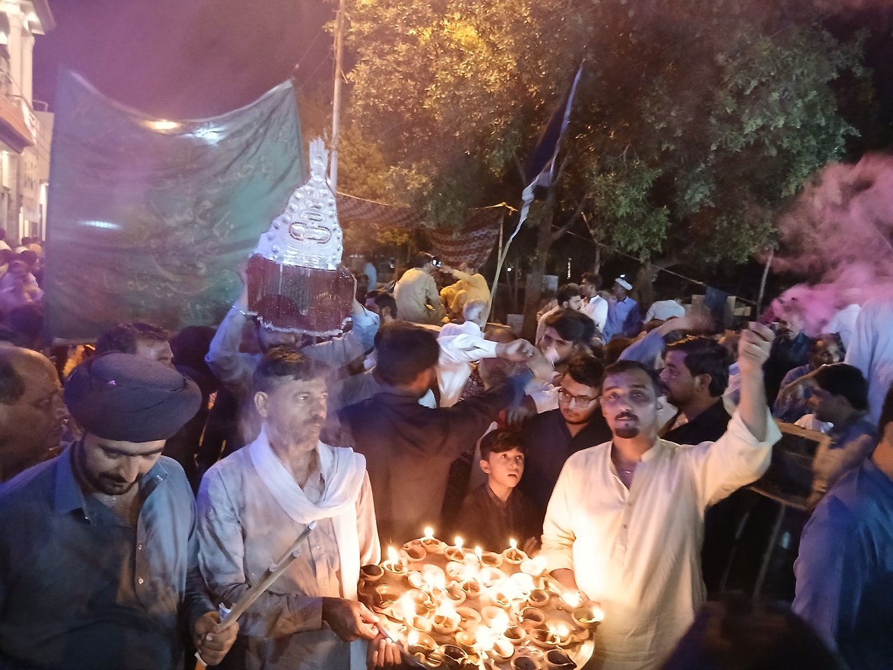 The devotees who come here from far away for their devotions, which they have prayed for, you can see that the brother is showing his happiness with colors. Before that, this brother had a lot of henna, which was in the name of Prince Imam Ali Asghar and he also distributed henna in the name of Akbar. So the festivals that we have are held more based on public wishes and there is a lot of polytheism involved in them.