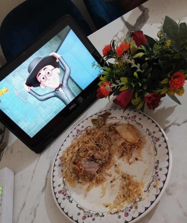 Along with the chicken pulao, I put cartoons on the tablet. My little daughter was also watching cartoons on the tablet with me and I was also feeding her with my hands, so I thought I would share my picture with you guys. I hope you guys liked my diary and you guys must remember me in your prayers and must pray for me that Allah Ta'ala keeps me away from financial disturbances because I am slowly going into complete depression and I have also contracted a lot of diseases due to diabetes. May Allah Protect us ameeen. Take care Allah Hafiz. ✨