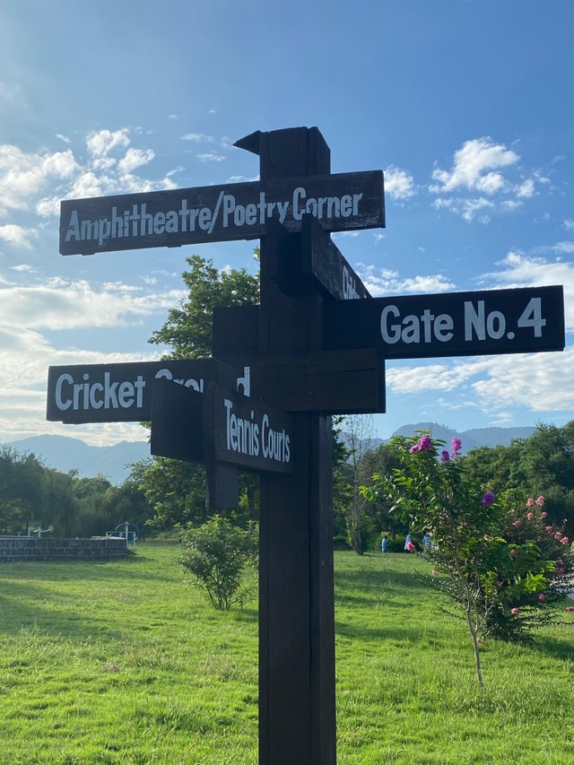 This is a directional board inside the park It guides visitors towards the cricket ground tennis court exit gates and other areas Such boards are very helpful in such a vast park to ensure that no one feels lostThe Benches