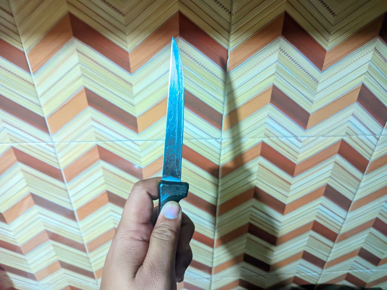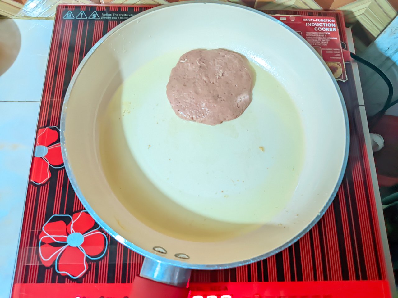 Then I took a container and placed it on the electric stove and heated some soybean oil there and spread the meat, and put it in the hot oil in the container.