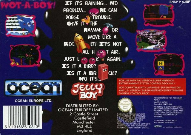 Jelly Boy is a platform game made by Probe Software for the Super Nintendo Entertainment System (SNES) and the Game Boy. It was released only in Europe in 1995 by Ocean Software.