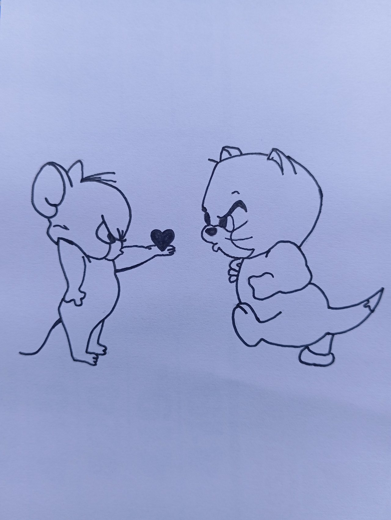 Now it's time to outline the Jerry and outlined his half body using black pointer. His hands giving heart to cat and face expressions using black pointer I outlined.