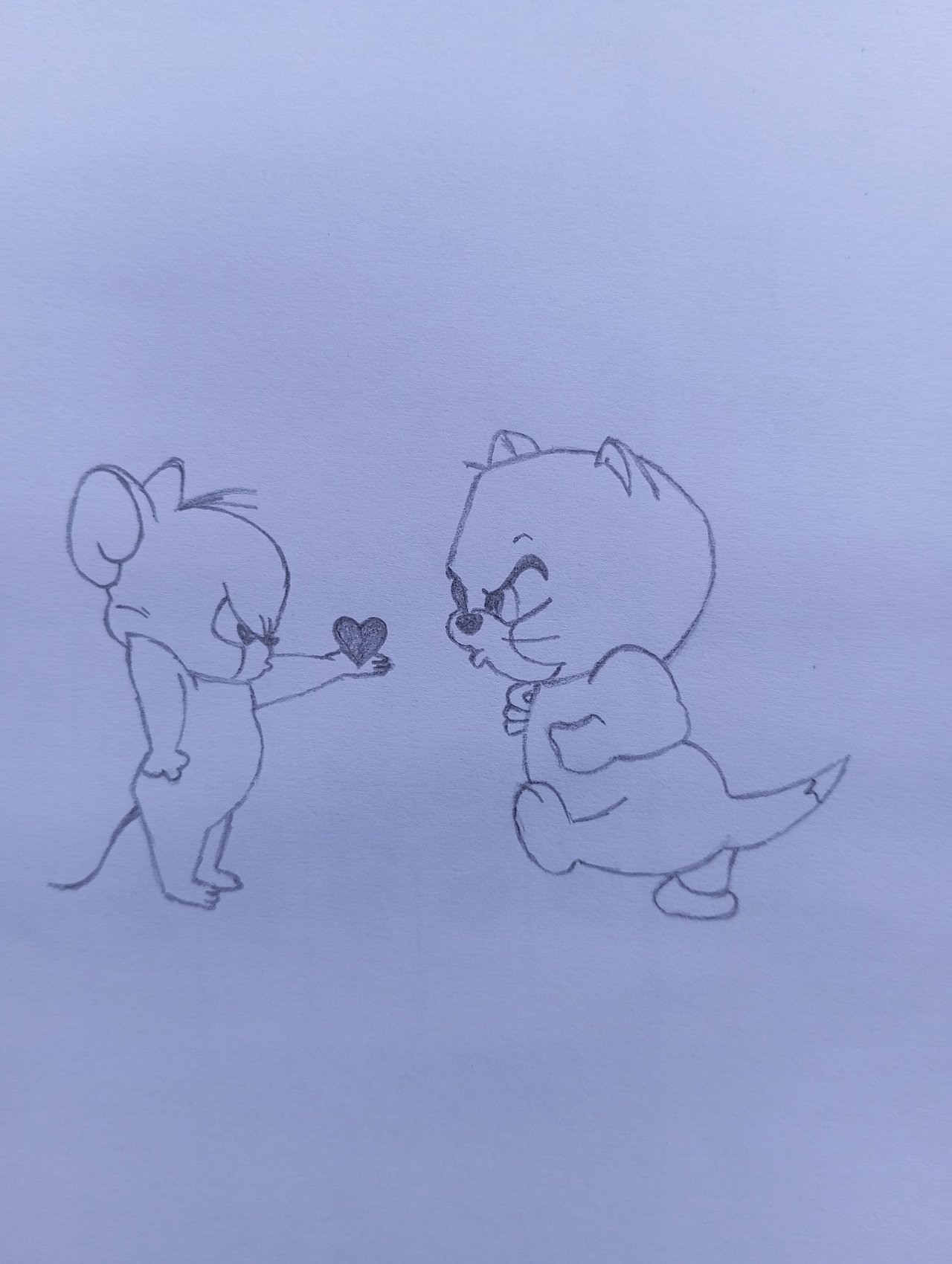 In the next step is very interesting because I draw a arm of Jerry that shows he gives his heart to cat.