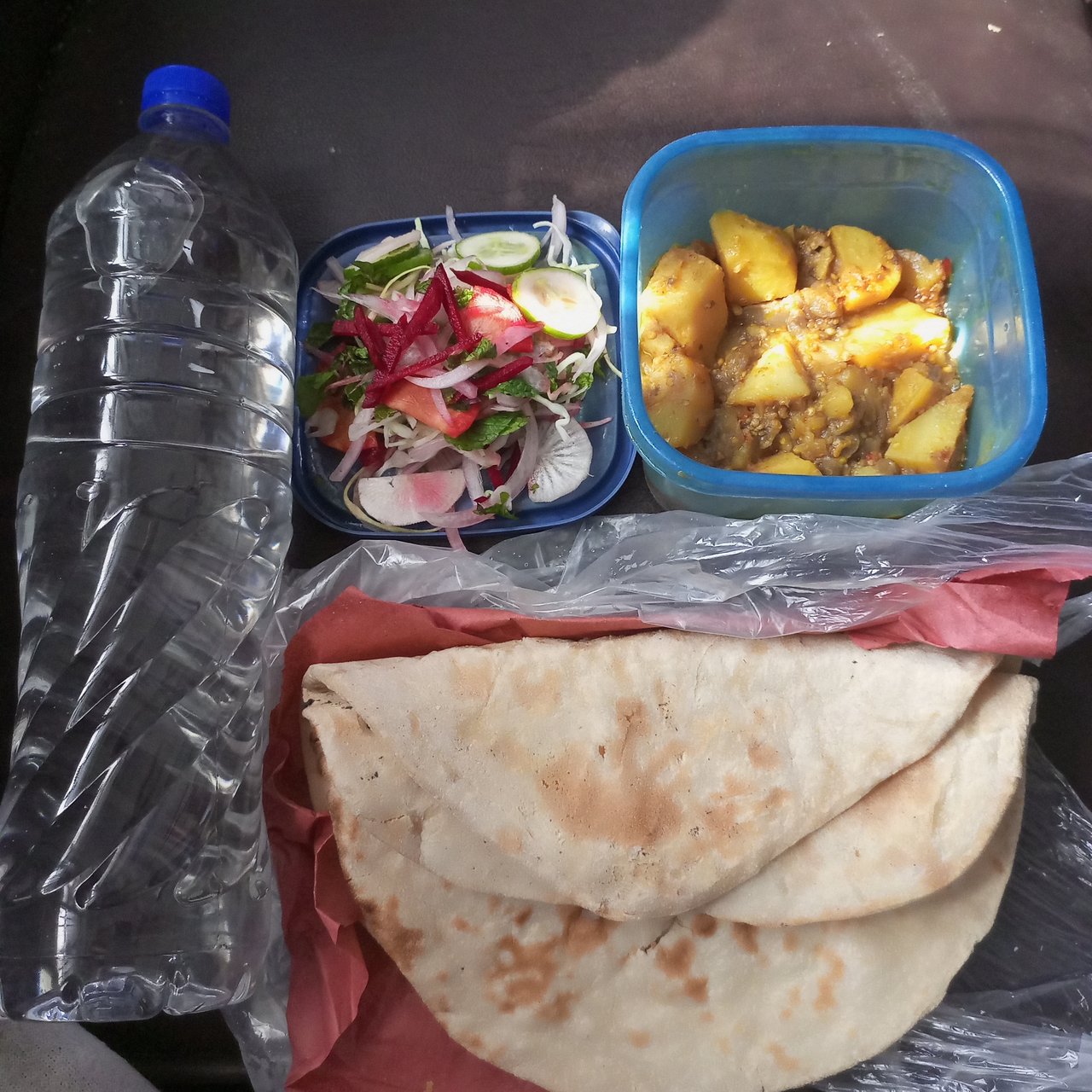 After that I enjoyed myself to a yummy lunch. A fresh salad and some mouthwatering potato and eggplant curry. My mother had made. I accompanied it by rotis from a nearby hotel. My lunch is good for me buddies to get through the rest of my shift.