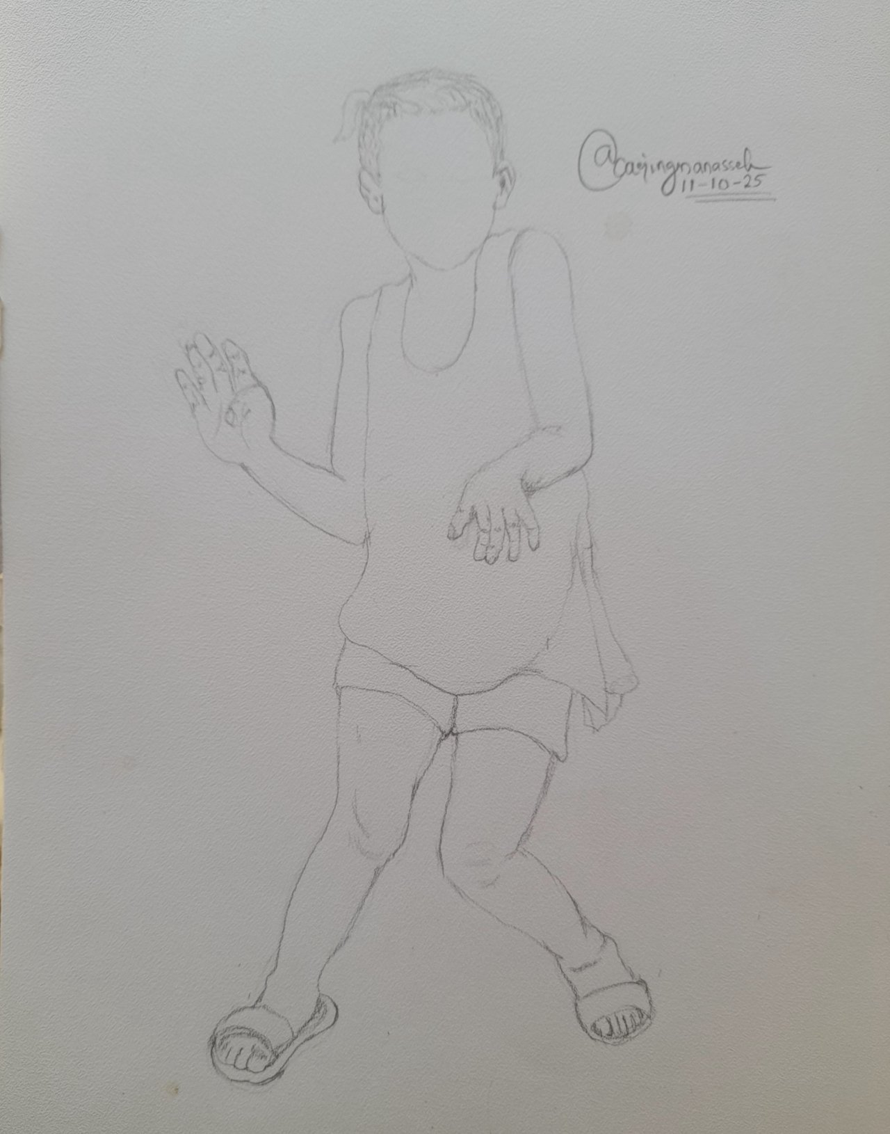 Here, I drew the shorts worn by the kid and after that, I drew the legs of the kid. I began with the right leg with the sleepers she put on and the same applies to the left leg. The legs were bent showing the kids' dancing steps.