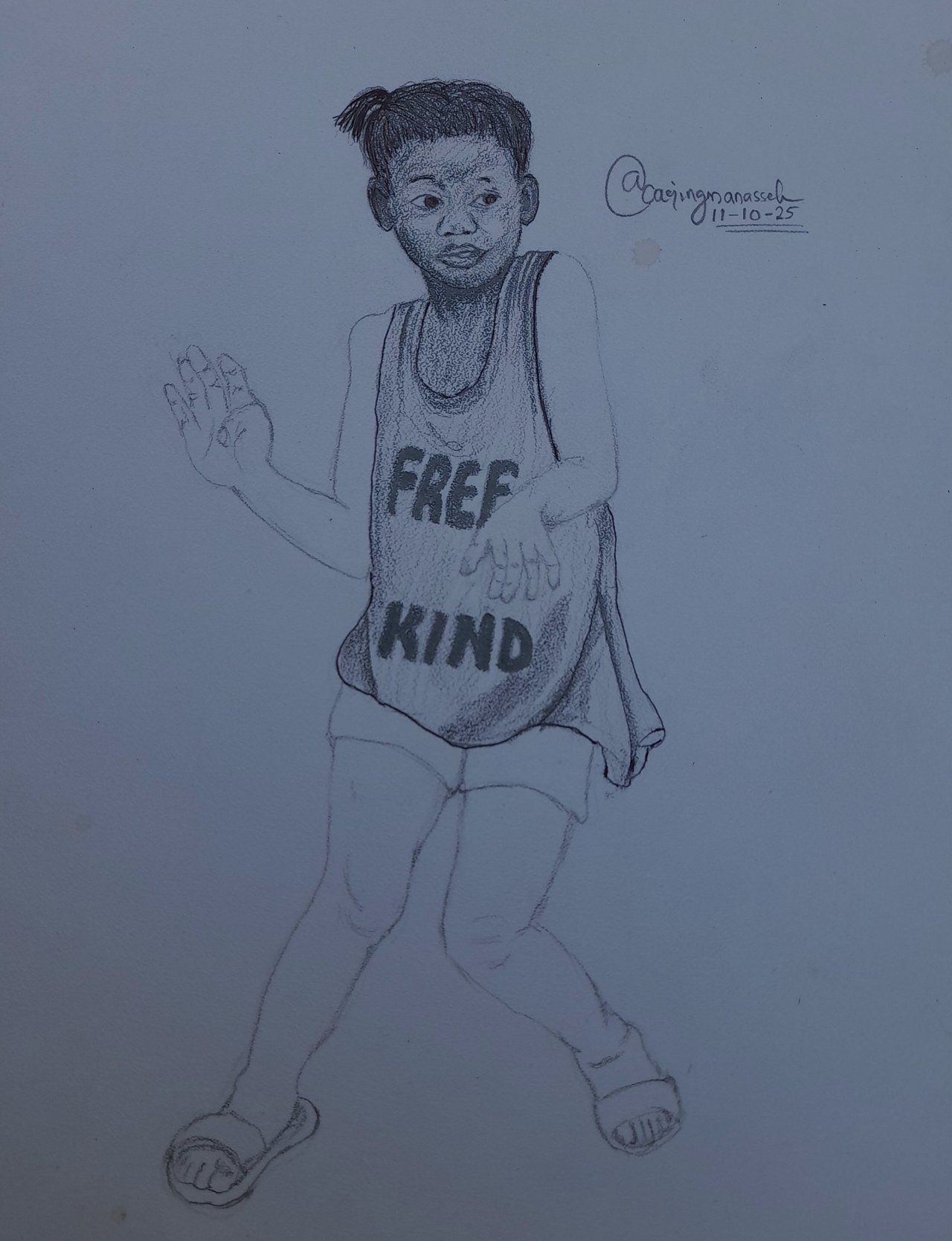 I drew the eyes of the kids, the eyebrow, the nose and the mouth. I also wrote the inscription "FREE KIND" on the front of her shirt.