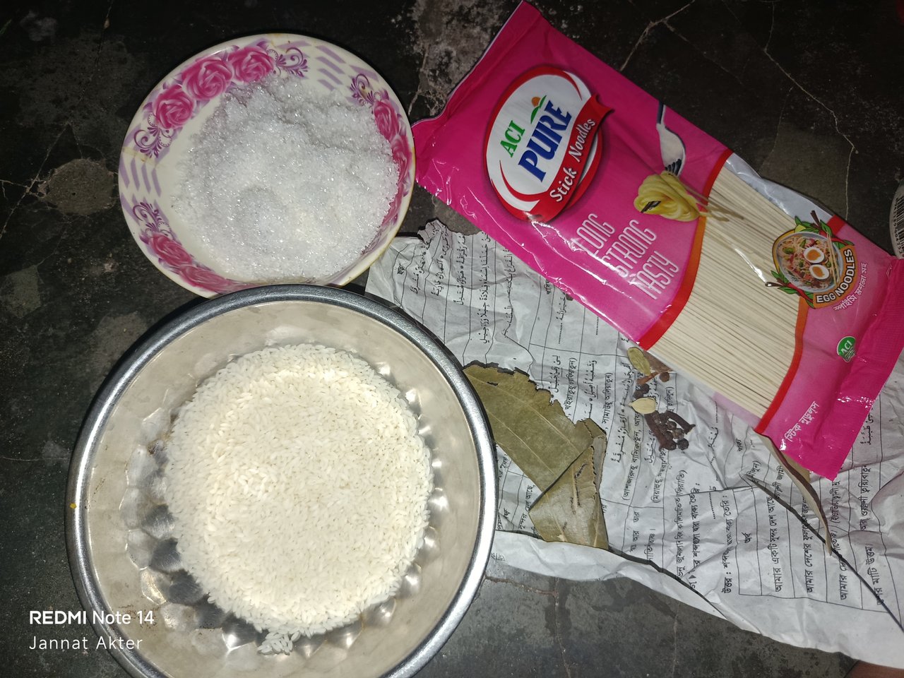 I will make a dessert item today. For that, I will take a packet of noodles, 100 grams of polao rice, a certain amount of sugar, and 1 liter of liquid milk.