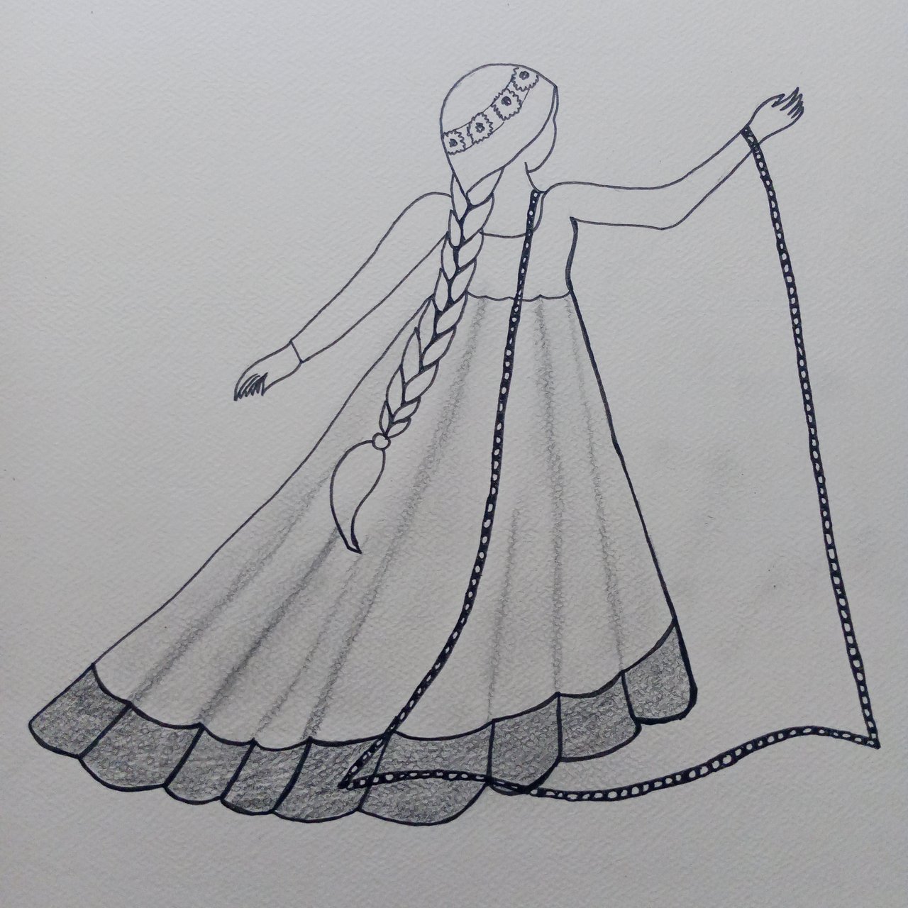 Then I drew some layers of her frock. Then I drew a beautiful flowered hair band on top of her hair. And then I started shaping her dupatta waving over her arm. I made the shape of the dupatta on the right side arm of the girl and in this way I completed the dupatta part of my drawing of the girl in this step.
