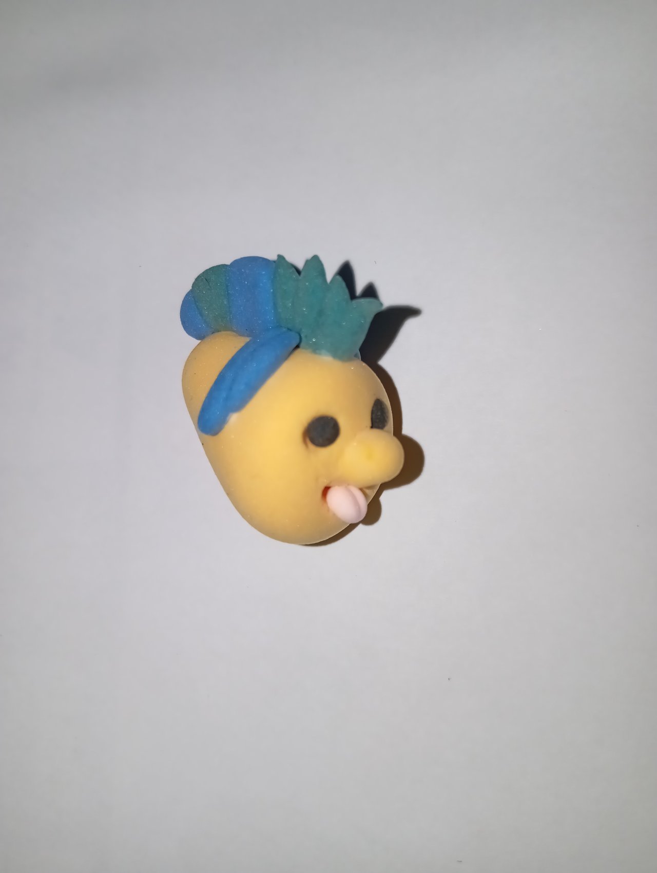 Your clay art is so cute. The little face with blue green hair looks adorable from all angles. I appreciate the details like the big eyes and tiny lips. Good luck !