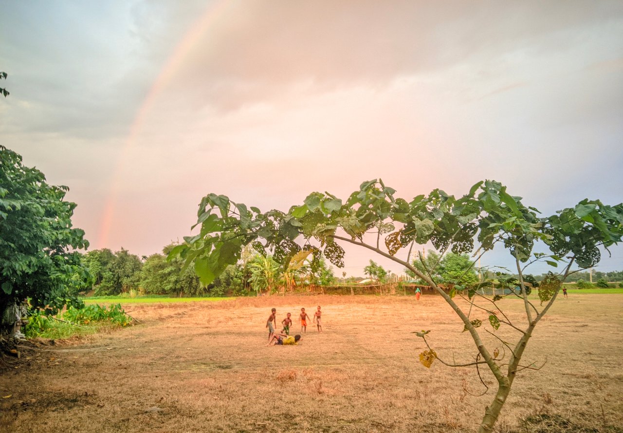 After When the game is almost over, the rainbow is also slowly mixedStarted I was standing next to the field and taking pictures of these wonderful moments through the gap of the tree. At the end of the game we were all very tired, but the mind was filled with happiness. After mixing the rainbow, I saw only light clouds in the sky and the soft light of the sunset. This field of our village is such where new stories are created every day.