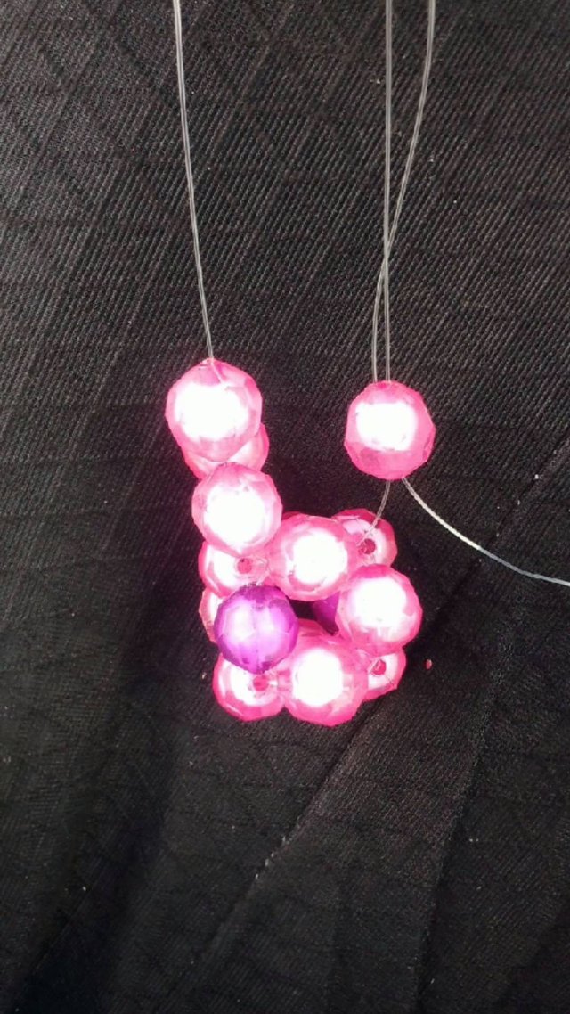 - Pull the line through the three beads you can see arranged close to each other. Since it's three beads, add one which would also act as in interlocking bead.