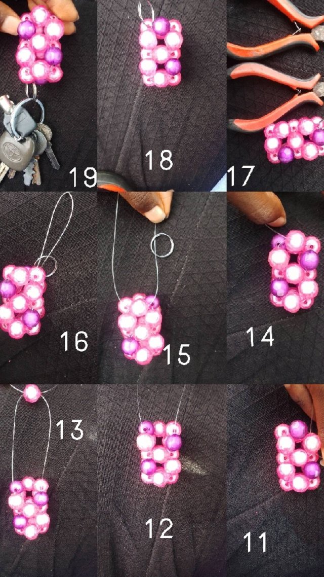 - Tighten your fist on the line and now you have a cuboid beaded keyholder…still in the making. It should give a structure as the picture labelled 14. Optionally you can switch colours to add to its beauty and you can continue upward depending on how long you prefer.