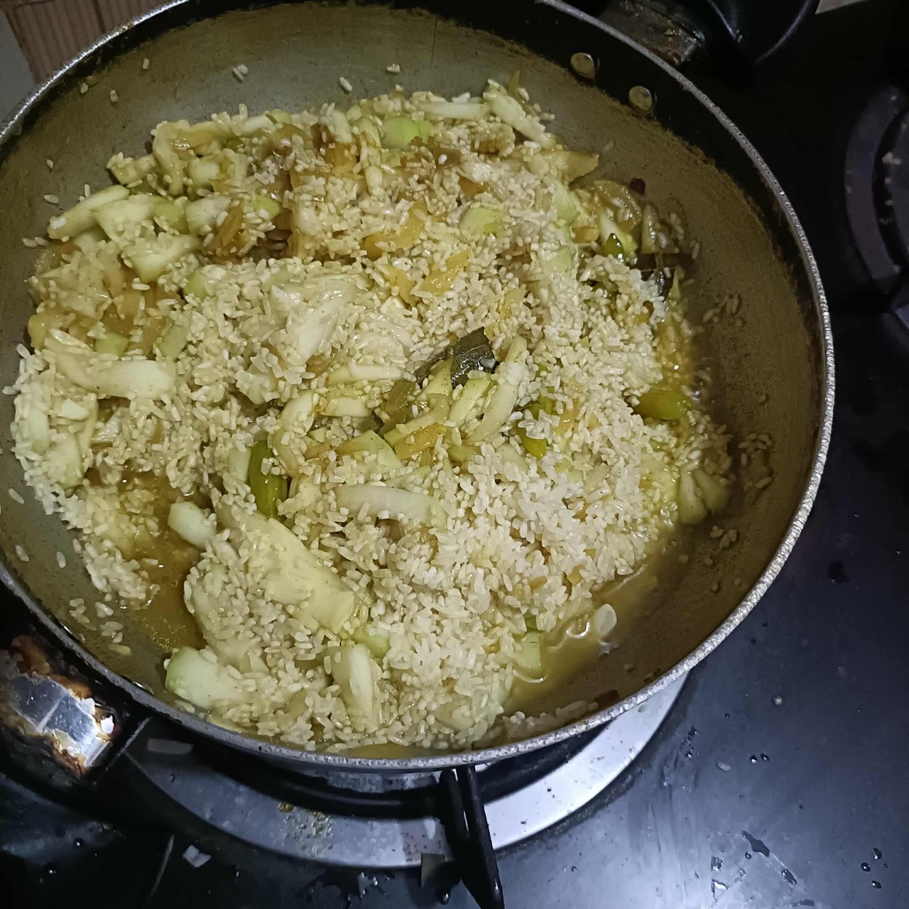 After cooking for a while, the gourds will become soft and release their water. Then I will add the washed parboiled rice here.