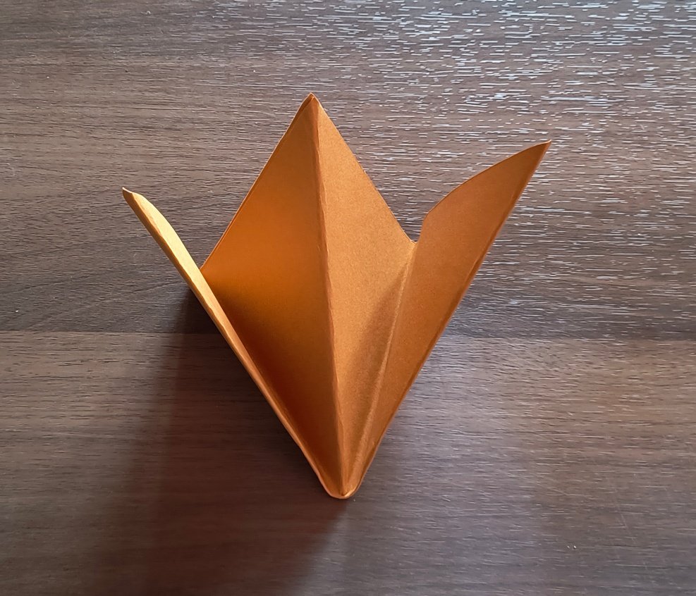 Now turn the little triangle the way that the free edges are there you can form a head of fox. So bend one edge 90 degree to form ear and that should be exact size like the other edge so that it looks like two ears.