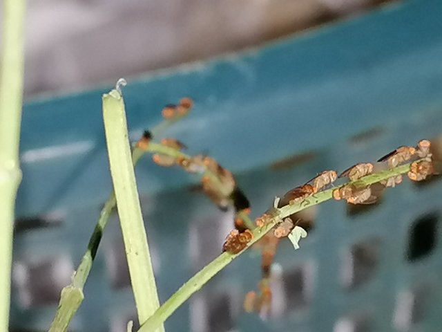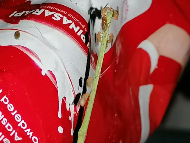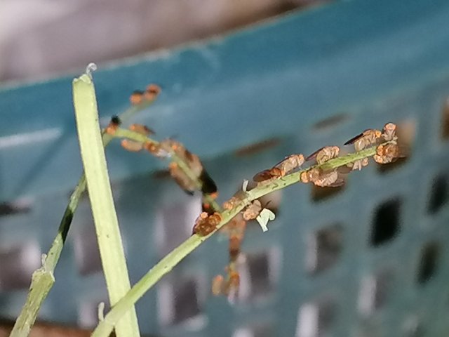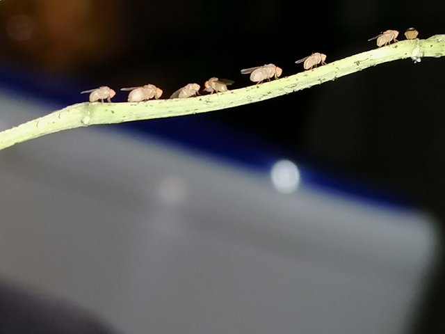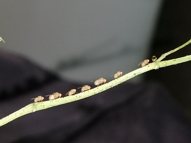 Earlier today, at breakfast, we cooked vegetable soup and we forgot to throw the stems away. When was about to get milk, then I noticed these small flies that rested on the moringa stem. They did not bother with me at all when I turned on the camera flash and came near to them. I think they all look so lovely.