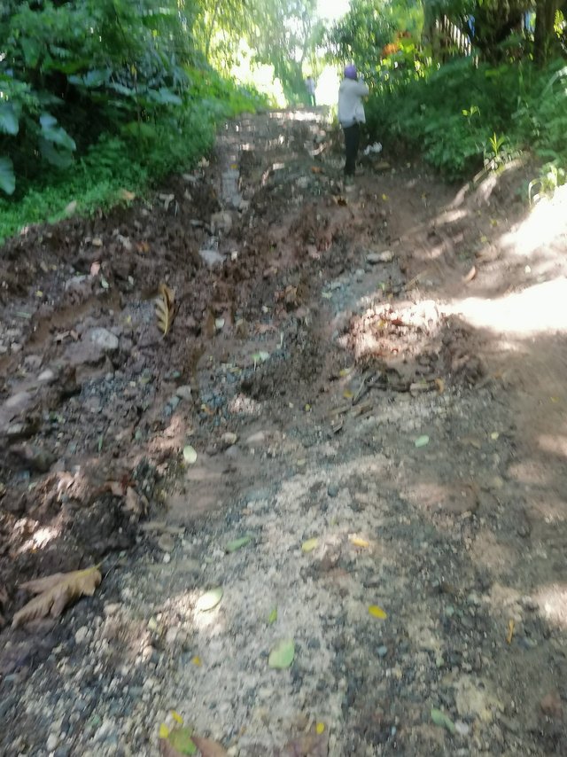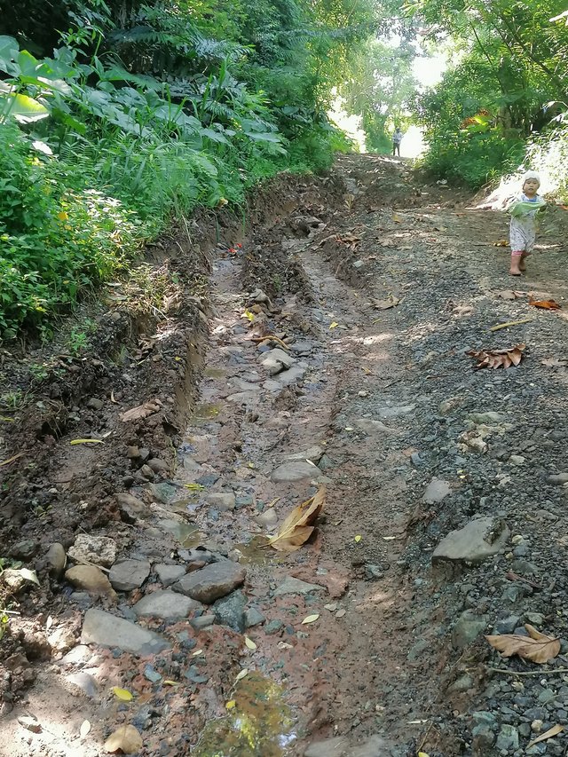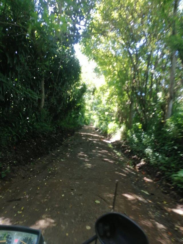 After a few minutes of traveling, we are on a rough road, the ground is still wet because the trees' shadows do not let the sun's rays to penetrate.