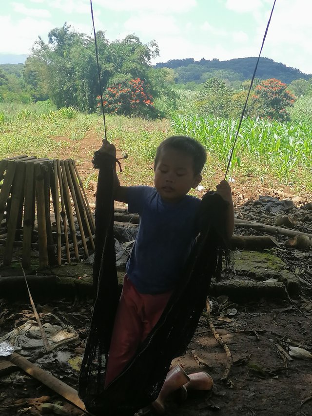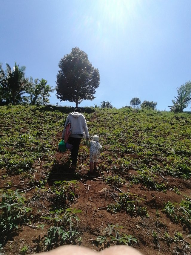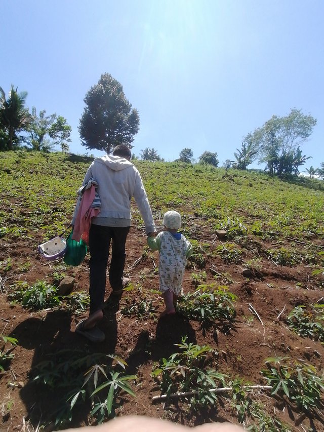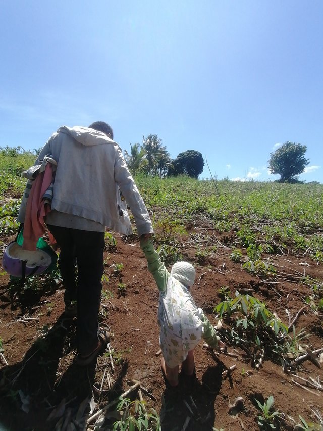 Czak picked old cassava sticks to play with, all he think about is play, not knowing that what we planned on doing there was to pull out the weeds that grew along the crops.