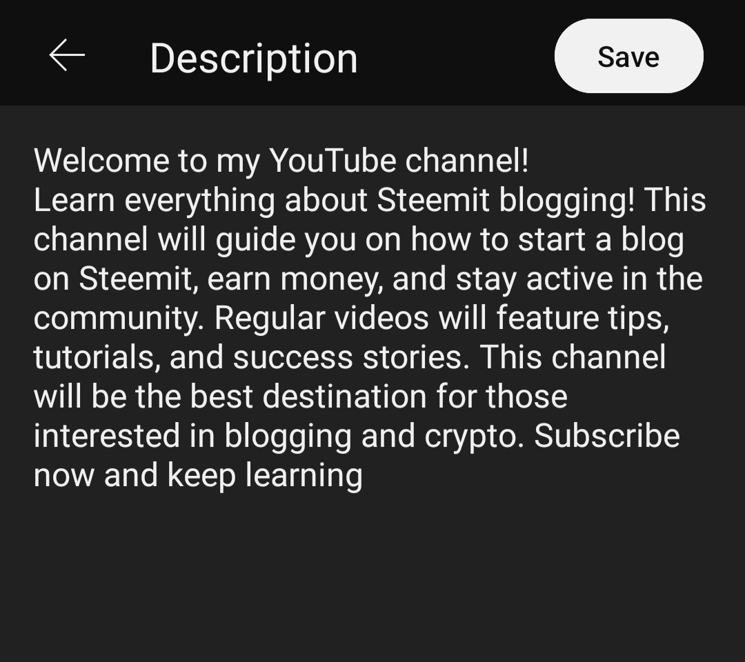 I have created a description for YouTube. I have also written it above and shared it with you. In fact, I have written some descriptions about what I will upload videos on the YouTube channel. I will try to upload mainly Steemit-centric videos on my YouTube channel and if people need help with how Steemit works and their work, they will tell me in the comments of the video and I will try to help them. When I was at the very last stage of writing the description, I clicked on the save option after writing the description. That's when the description was saved on my YouTube channel.