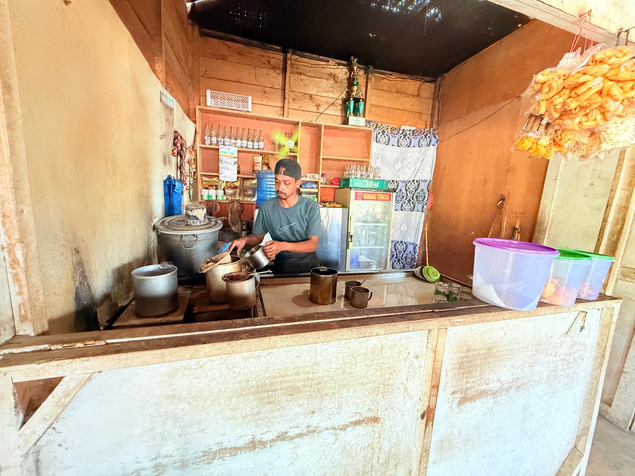 Di dekat meja barista terdapat meja yang mana disana terdapat kotak-kotak kue. Dalam kotak kue tersebut terdapat kue-kue yang sering di jual di warkop Aceh misalnya kue bakwan, pisang goreng, donat, kue puta, timphan dan sebagainya.