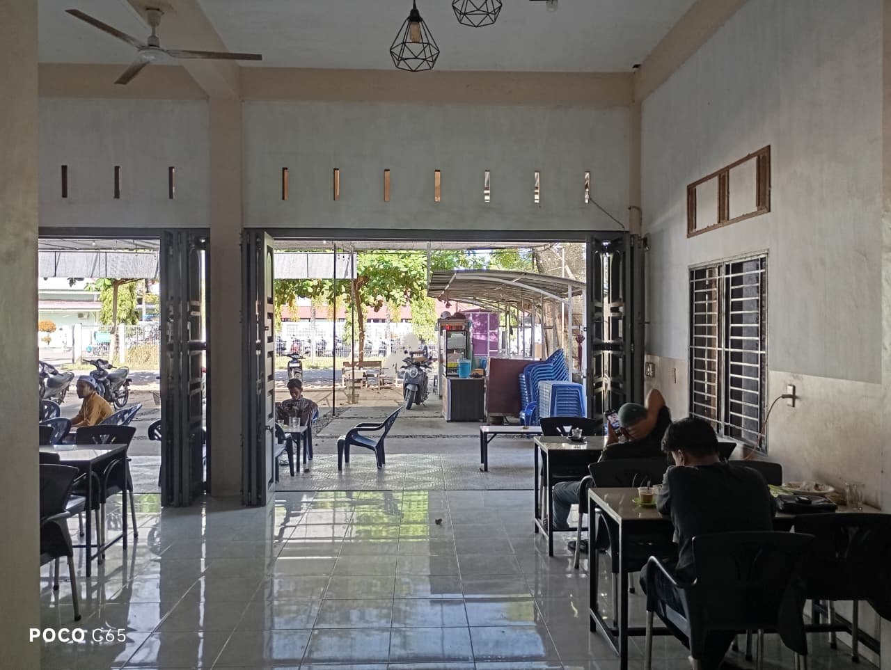 Di depannya juga banyak rak rak makanan yang berjualan dan seperti di foto itu adalah rak ayam geprek yang betjualan di depan warkop tersebut.