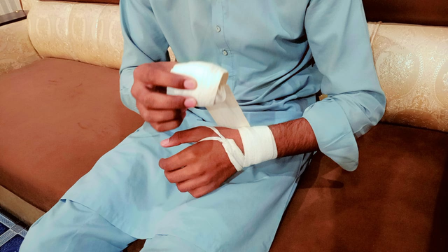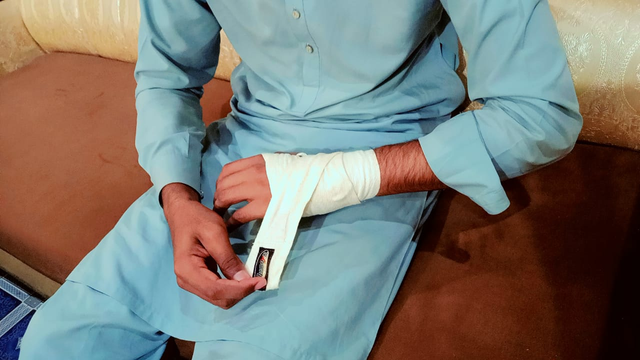 The bandage I had had a starting and ending point. I started it with my thumb first and wrapped it around my thumb and over my entire hand, making sure I didn't wrap it too tightly to keep my blood circulating. This often happens. If you wrap it tightly, it stops the blood circulation, which causes more swelling.