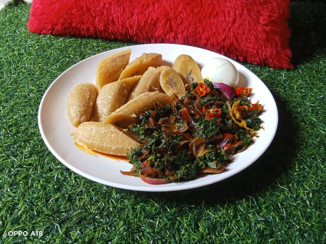 Local delicacies: Boil plantains with vegetables sauce by @dequeen