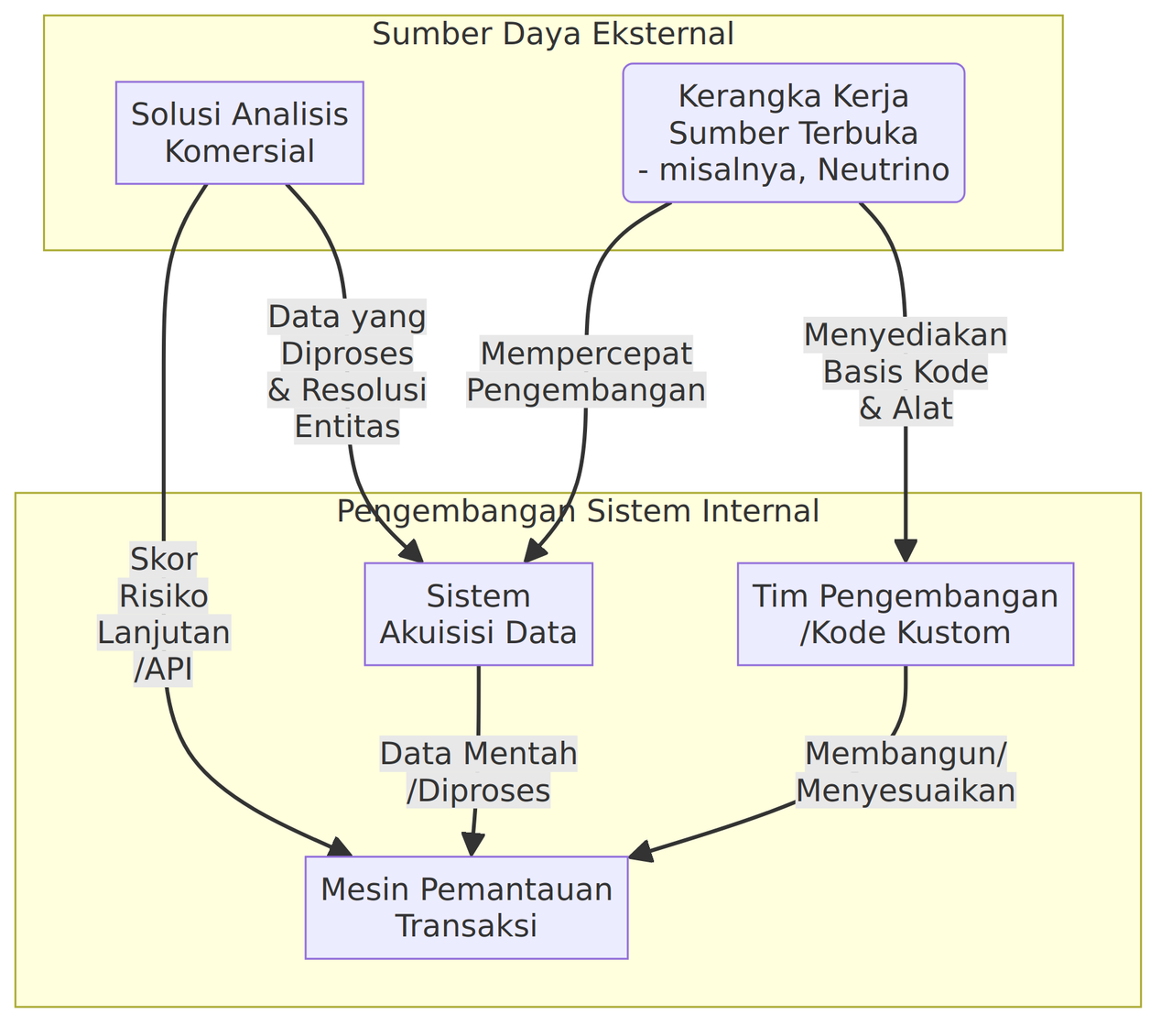 Komponen Alat dan Sumber Daya mencakup integrasi solusi analisis blockchain komersial untuk akses data dan resolusi entitas tingkat lanjut, serta pemanfaatan kerangka kerja sumber terbuka seperti Neutrino guna percepat pengembangan fitur analisis khusus