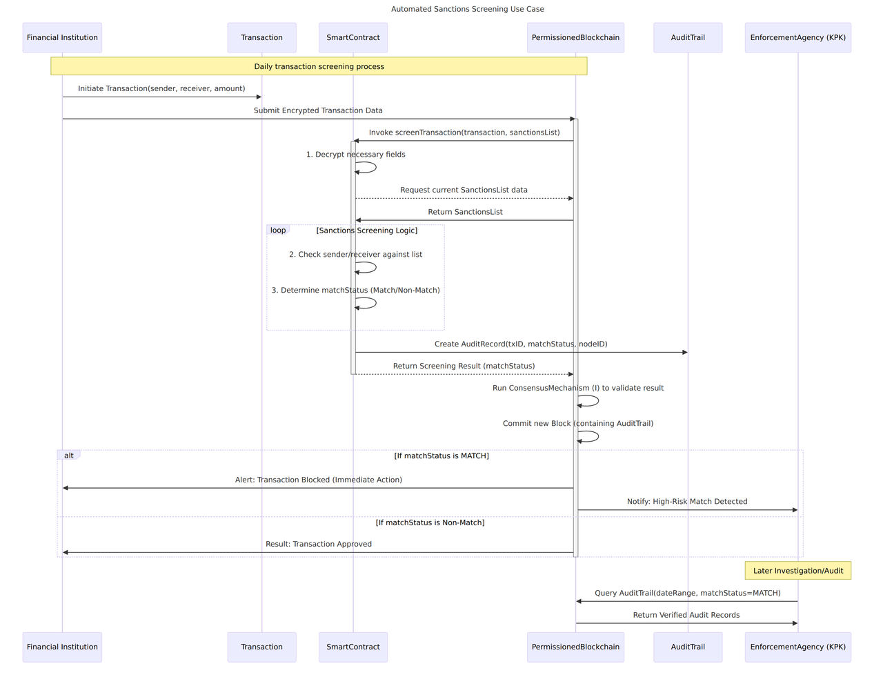 Oleh karena alasan ini, keputusan yang jelas untuk sistem penyaringan sanksi dalam konteks ini adalah menggunakan blockchain berizin. Ini memastikan bahwa hanya partisipan yang telah disetujui sebelumnya, seperti lembaga pemerintah, bank sentral, dan lembaga keuangan yang teregulasi, yang dapat bergabung dengan jaringan. Ini menjamin keamanan dan integritas yang diperlukan untuk kepatuhan keuangan dengan keamanan tinggi. Lebih lanjut, sistem ini memungkinkan privasi terenkripsi dalam data transaksi sekaligus menjaga jejak audit bersama yang transparan di antara anggota yang telah diverifikasi. Bersama-sama, fitur-fitur ini secara langsung mendukung kepatuhan regulasi dan tujuan antikorupsi.