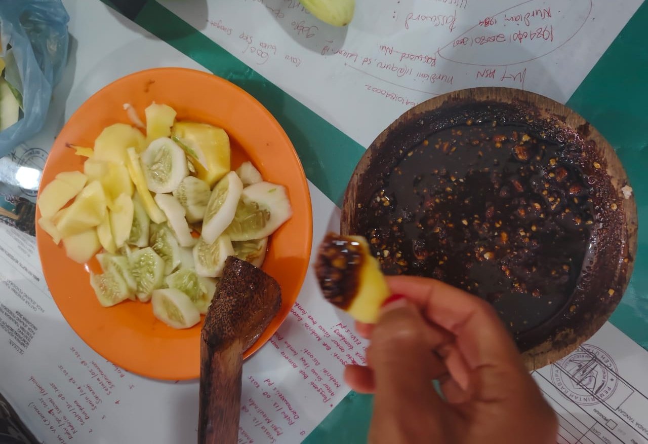 Often, fellow teachers at our school bring various fruits and vegetables to make into rujak. During break time, some of my classmates clean the fruits and vegetables, while others make the dressing. So after that, we enjoyed the rujak together by dipping it in the sauce, which was quite spicy and sweet.