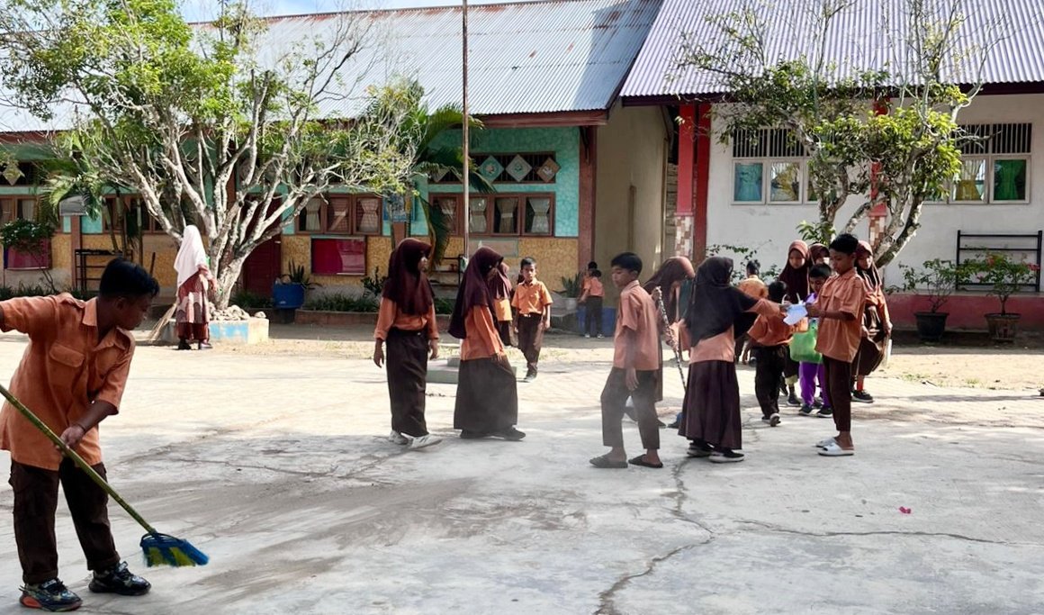 Selanjutnya kami pun langsung memfasilitasi anak-anak untuk bergotong-royong bersama beberapa saat, yakni membersihkan peperangan sekolah di awal pagi hari ini.