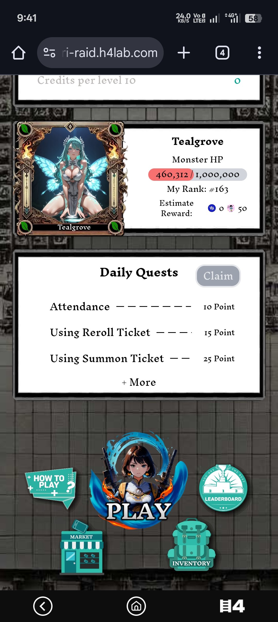 Today I am sharing with you another episode of Hari-Raid games connected to the steemit platform. As you can see in the screenshot, my current level is 8 and available credit is 38. As before, after entering this game, I clicked on the play button and after clicking on the play button, I clicked on summon from the page that came up.