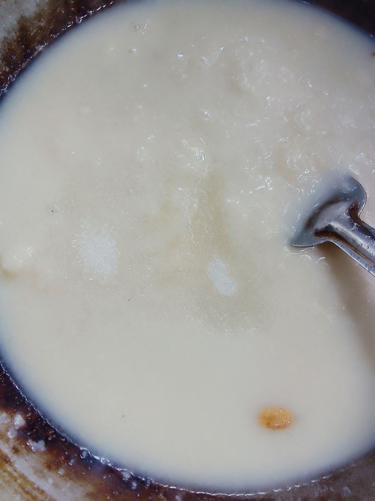 Then I put one cup of water in a pot on the stove again. Then I added half a cup of sugar to that same cup and stirred it. Then I added salt to taste. After that, I stirred it well for a while.
