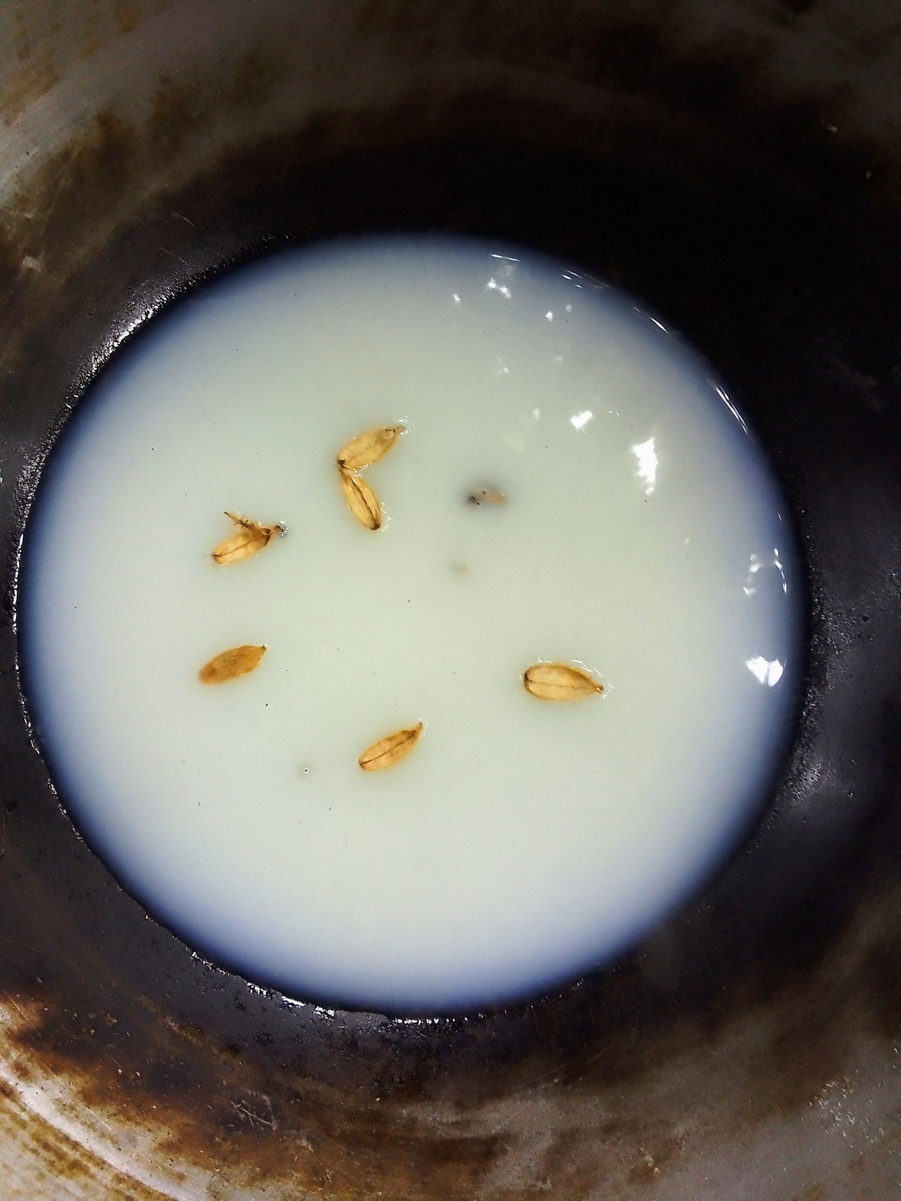Once the sugar has melted, add a cup of milk to it. Then add a few cardamom pods. Then stir for a while and let the milk boil well.