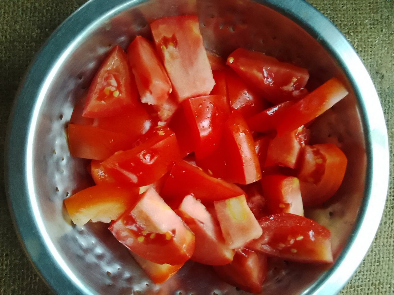 First, I cleaned and washed two red ripe tomatoes and cut them into small pieces.