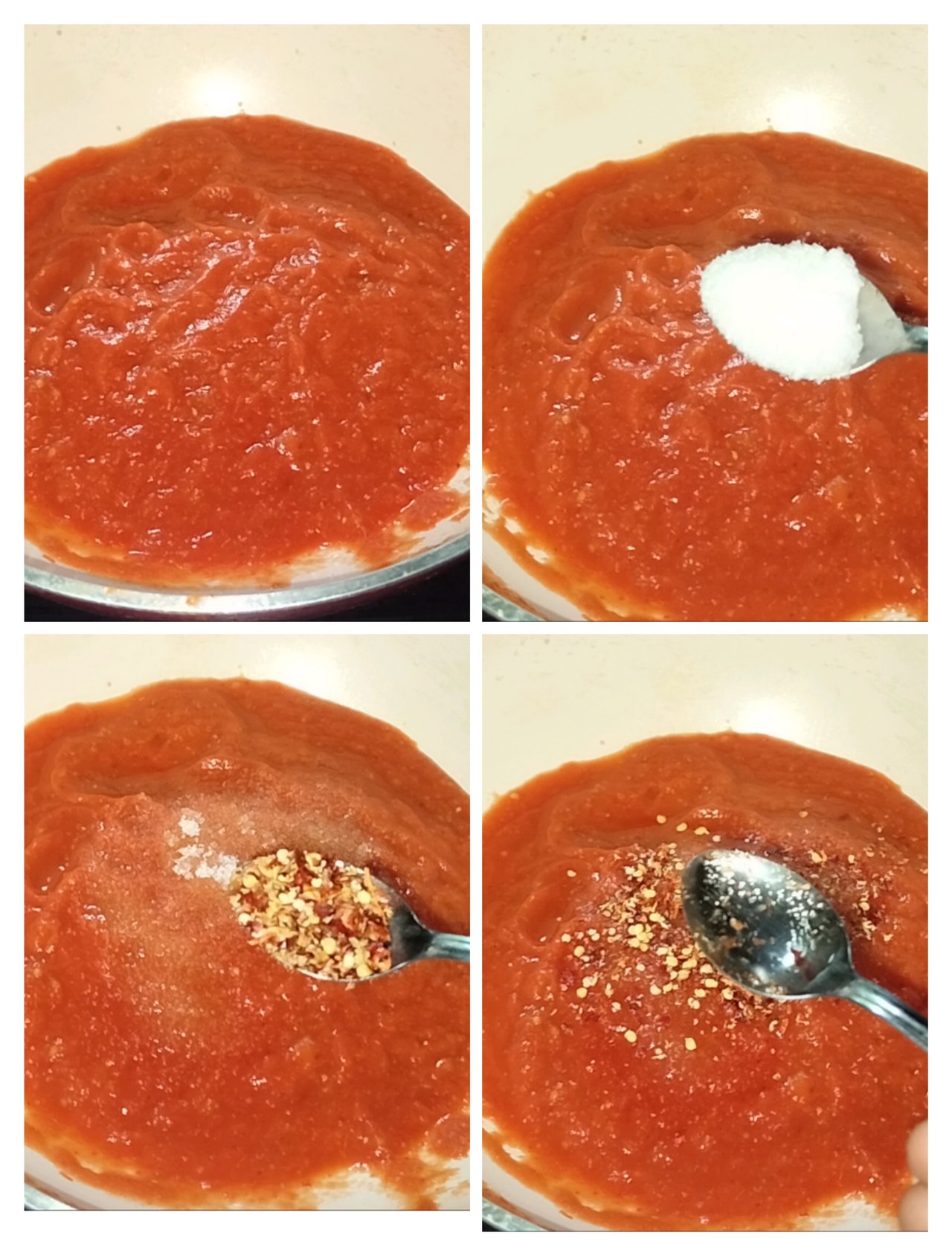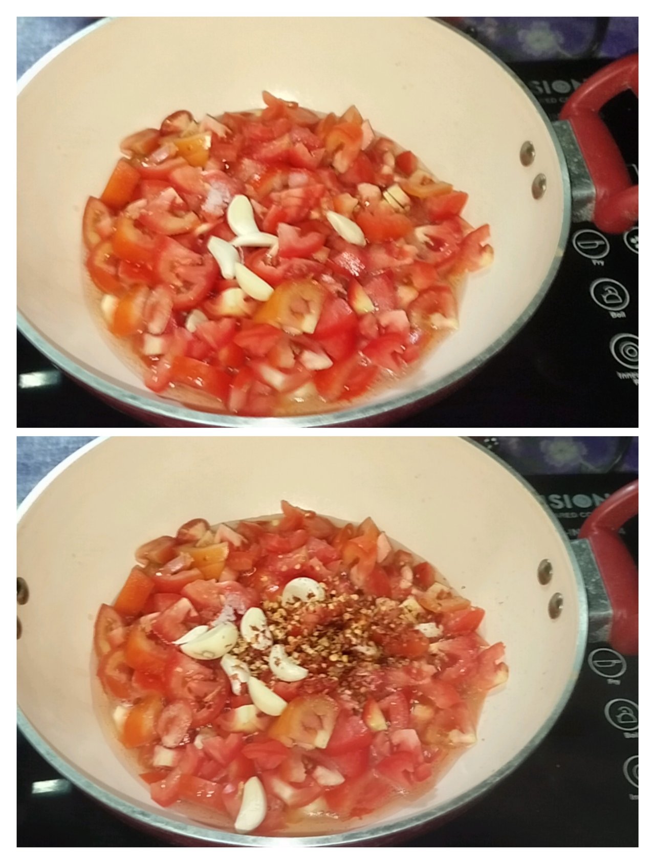Then I put a pan on the stove. In it, I added the tomatoes. I added garlic, chili flakes, and salt. Then I boiled them like this for a while.