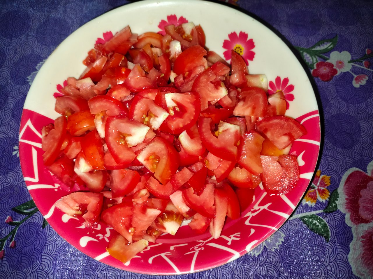 First, I cleaned and washed the tomatoes thoroughly. Then, I cut the tomatoes into small pieces.