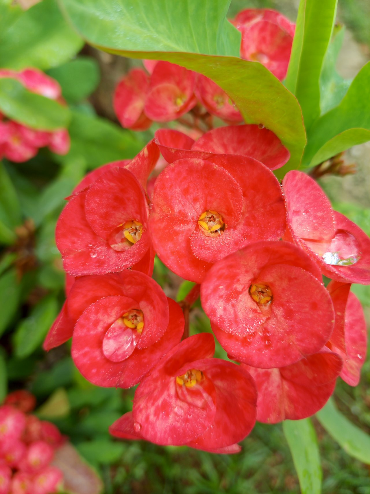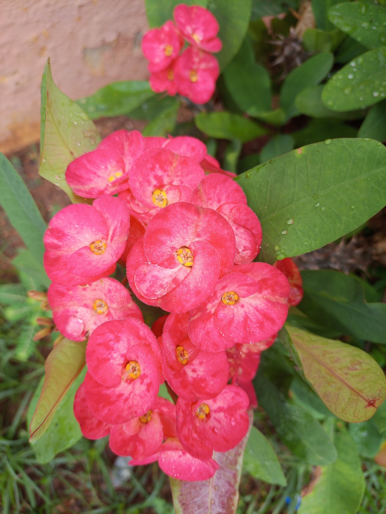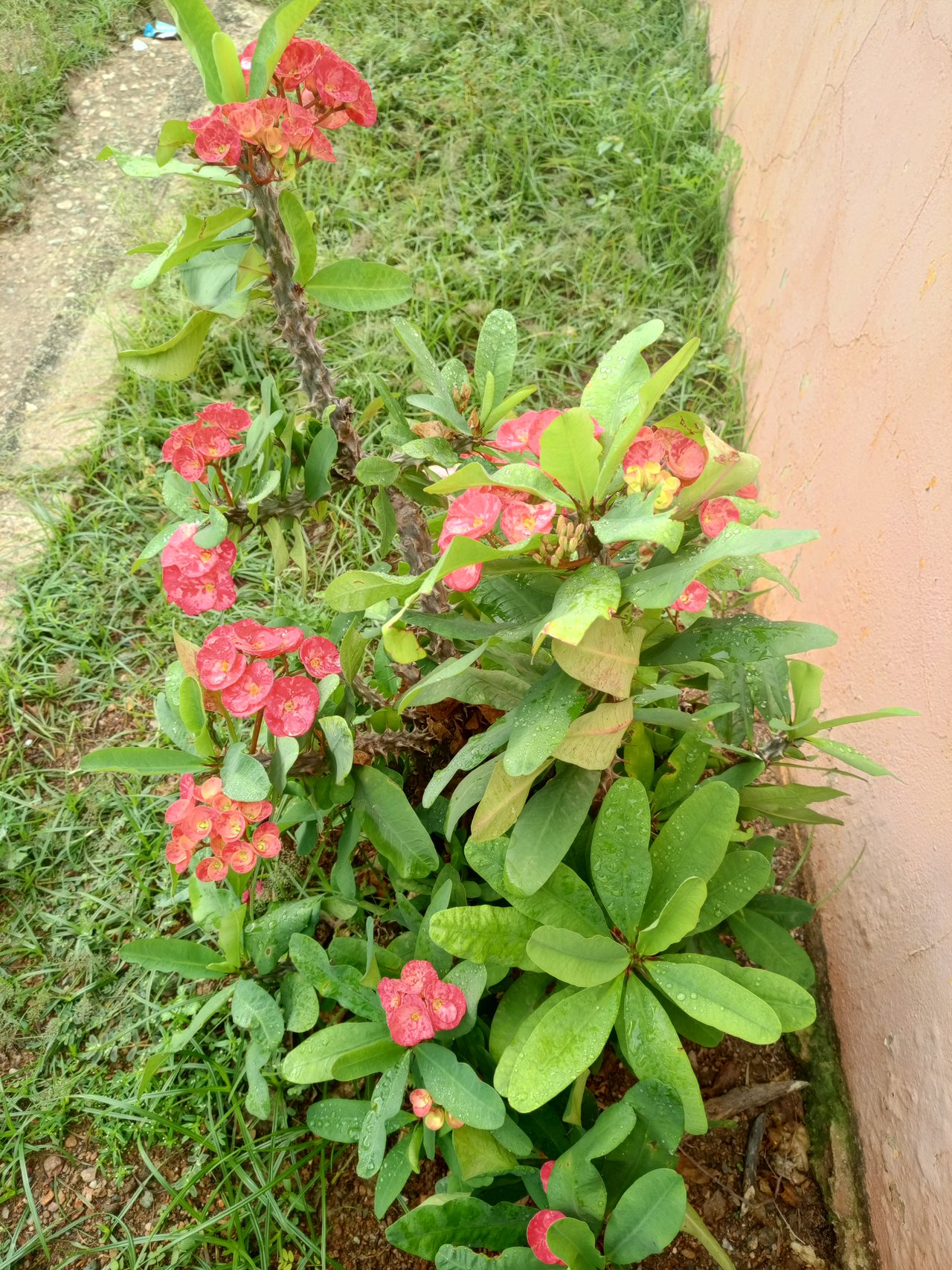 Good afternoon to this beautiful Steem Spaceh community. I come to you with this lovely plant that I have in front of my house. I'll tell you that I had several, but the pests dried them out and only this one remained. It was ugly, but overnight it became very beautiful. For about three days now, it has been opening such beautiful flowers. After fighting so hard against the pests to let it live, I was surprised this morning when so many bunches of flowers suddenly bloomed. At dawn, the flowers looked beautiful, shining with the dew from the rain. It was an unexpected spectacle, full of life. The rains have helped it so much that it continues to beautify the entrance to my house. I am so happy to have my crown of thorns plant back.