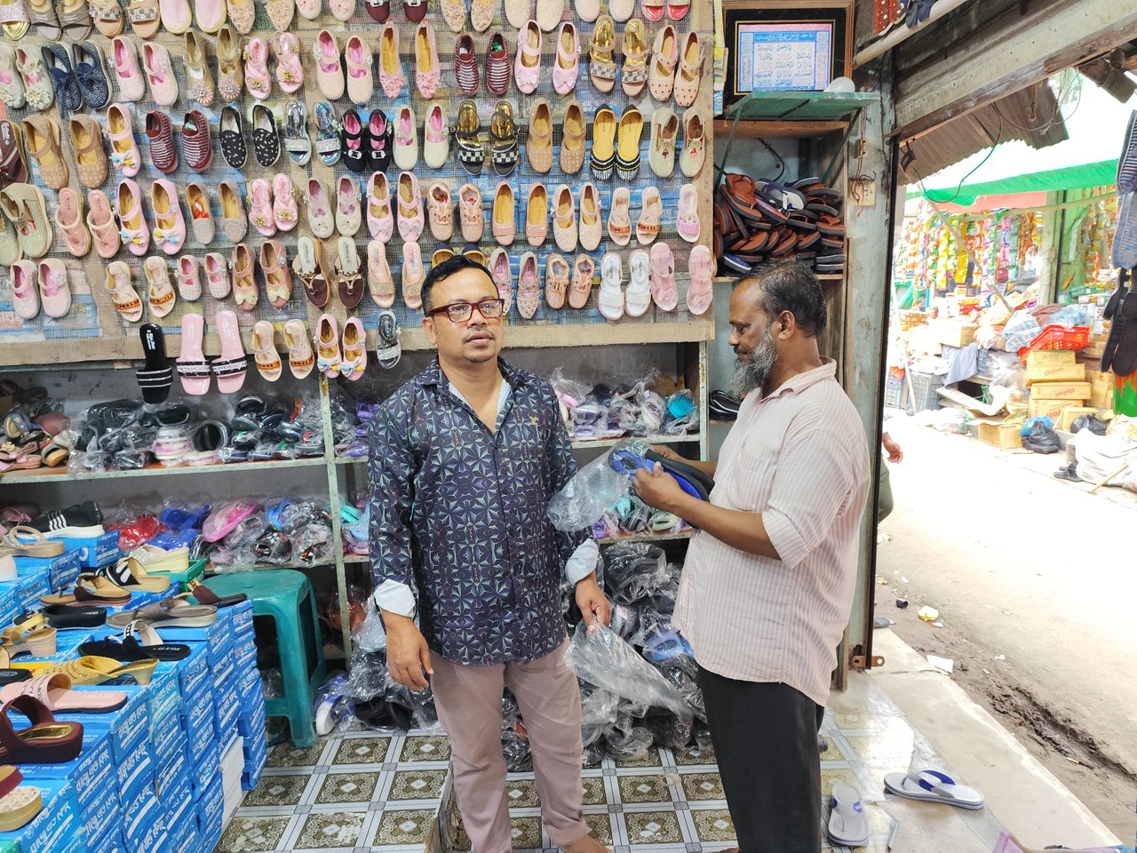 And you will be impressed by the expression on the man's face when you come here. Although this shop has another staff. Because it is noon, that man is not in the shop now. This shop does not close at noon. However, most shops in the market close at noon. And this shoe shop opens in the morning and closes at ten at night. And every shoe here is of high quality. That is why I bought sandals and another pair of shoes that day. And I bought shoes for my daughter from here. Because my daughter is almost three years old. That is why she likes to wear different types of shoes.