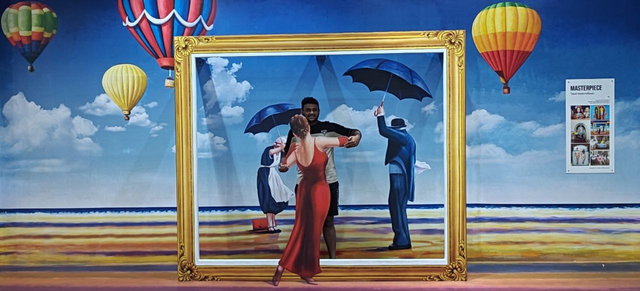 The second room had artworks where we could act like we were dancing, performing, or even posing like the Mona Lisa. My favorite was the ballet dancer pose, while Harith got the chance to dance with a beautiful lady there.