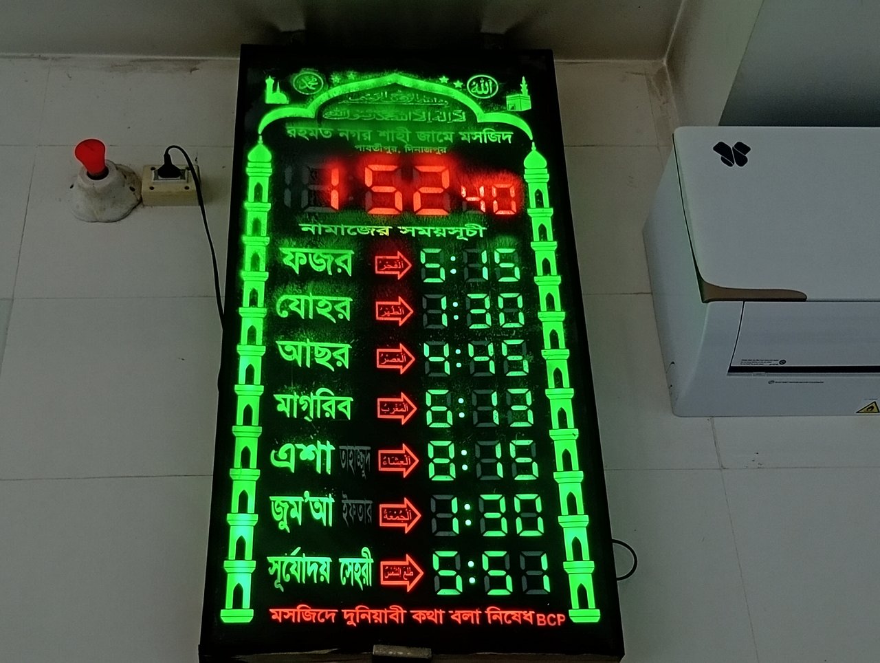 Digital clock and prayer schedule |