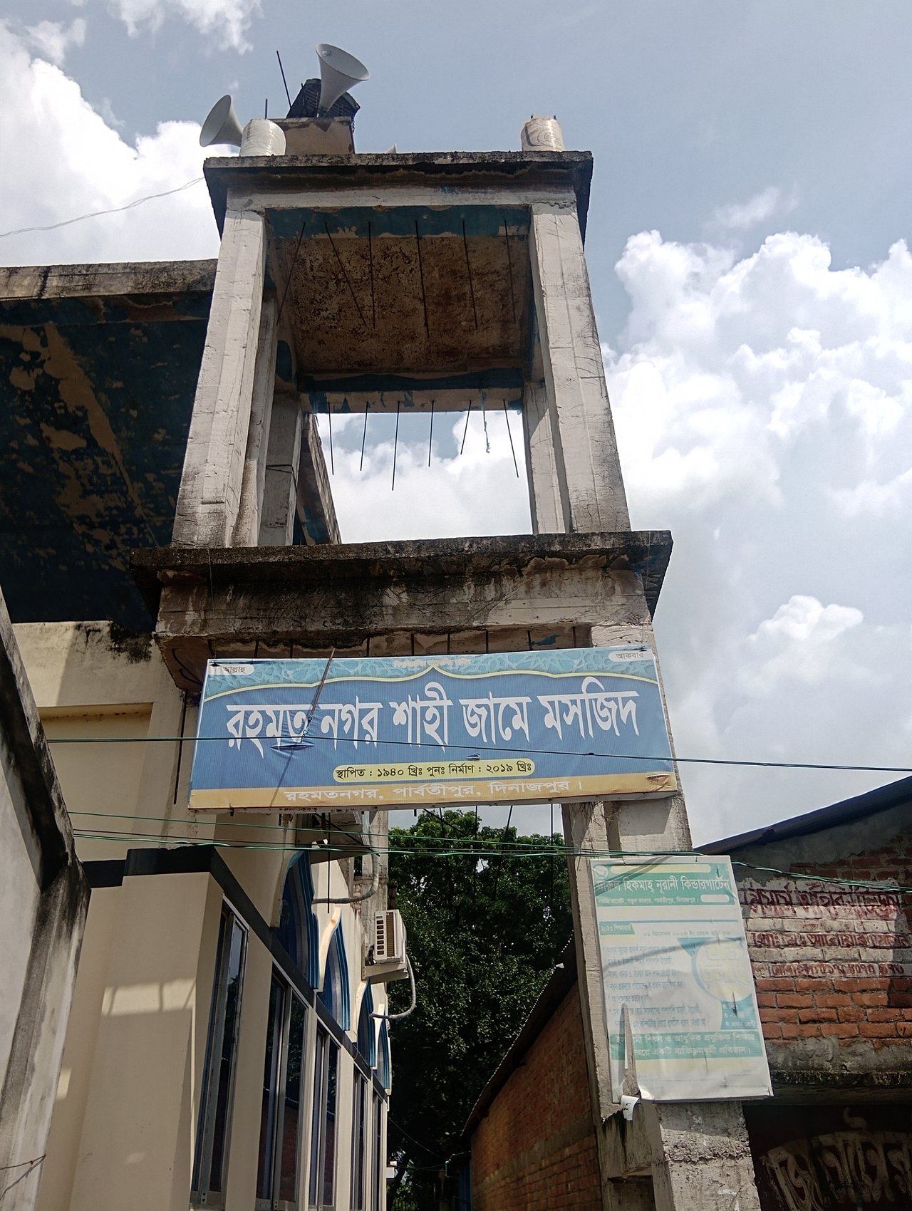 A signboard of the mosque on the road leading to the mosque. Some microphones are set at the top of this minaret through which the sound of the call to prayer reaches the entire area |