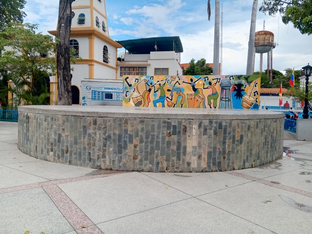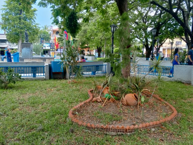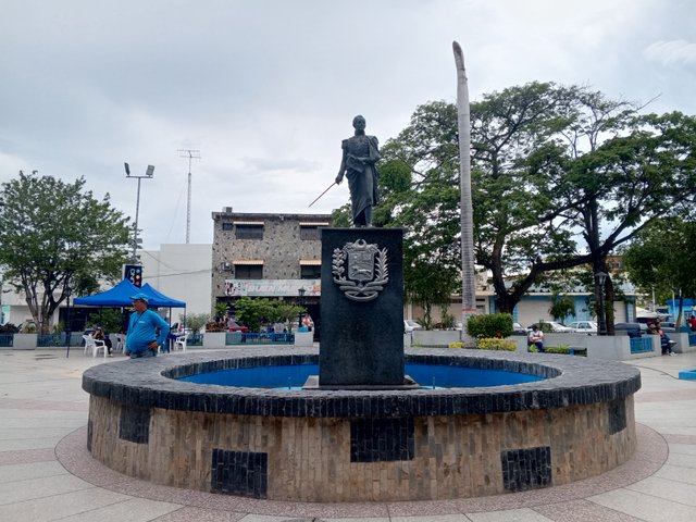 En el centro de la plaza está una fuente con estatua elaborada en bronce de Simón Bolívar tiene tallado el Escudo Nacional, aquí convergen los ocho pasillos con los que cuentan, la plaza cuenta con jardines divididos por brocales y bancos de cemento rodeado por grandes árboles y flores, constantemente hay un personal de la alcaldía realizando mantenimiento por lo que esta muy limpia y conservada.
