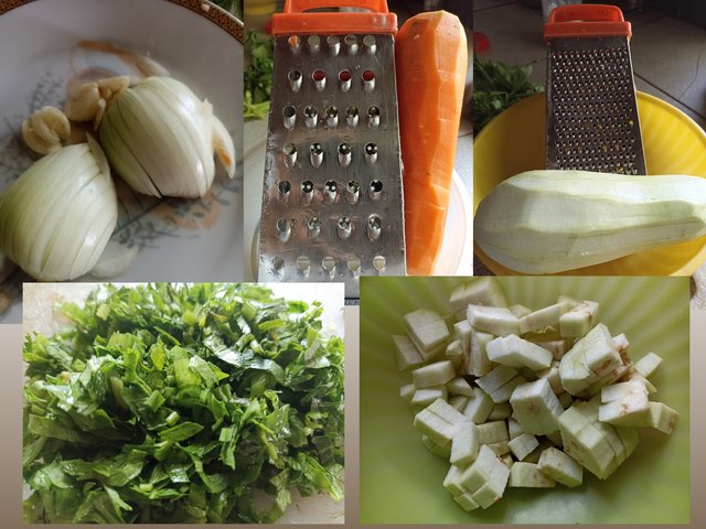 Inicié con los cortes, rallado y triturado de los vegetales, según lo que correspondiera a cada caso, obviamente, y los dejé separados hasta el momento de hacer las respectivas mezclas. Por supuesto que algunos como la cebolla y el ajo los coloqué en el mismo recipiente porque irían juntos a la sartén para sofreír junto con la berenjena (solo que esta última debía largar su amargo en un recipiente aparte) y luego ser mezclados con los demás.