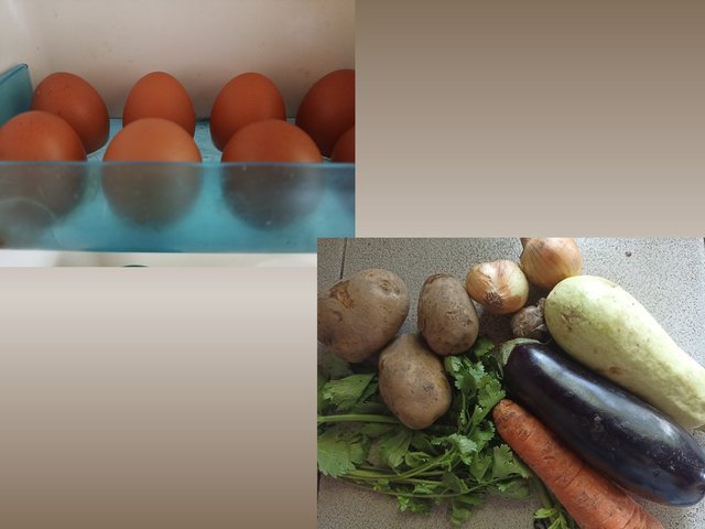 Bueno, lo primero, los ingredientes. Casi todos los tenía ya en la nevera porque hago la compra los domingos en una venta de verduras cerca de casa. Aparte de los vegetales, había comprado huevos en un supermercado cercano a mi taller de costura