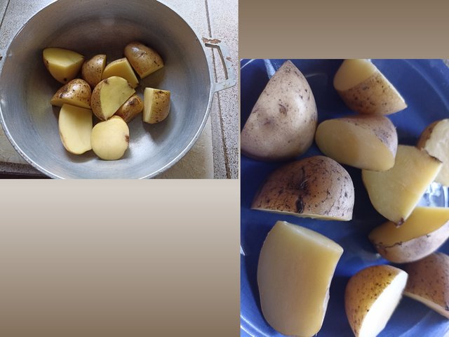 Aparte, había cortado las papas en mitades porque eran medianas y las había colocado en una olla en agua con sal para sancochar. Cuando ablandaron, las puse a reposar fuera del agua en un plato para luego pelarlas cuando estuvieran a temperatura ambiente.