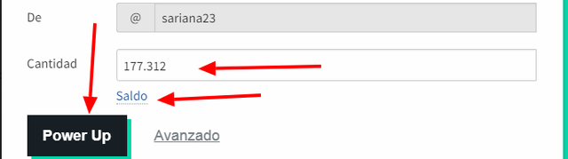 Doy clic en la "v" invertida que aparece en mis steems líquidos y entre las opciones elijo power up. Cuando aparece la ventana emergente donde debo colocar el monto a encender, como de costumbre, selecciono el total de mis STEEM líquidos dando clic en saldo, lo que es igual a 177.312 STEEM.