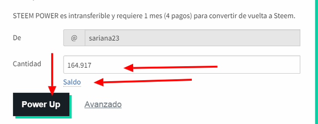 Estando allí, hago clic en la "V" invertida, donde se desplegarán varias opciones, y hago clic sobre la palabra Power Up. De inmediato se abre una ventana emergente donde debo colocar la cantidad que deseo convertir a Steem Power; como en mi caso quiero cambiar todos mis Steem, hago clic en saldo y se reflejará el monto total.