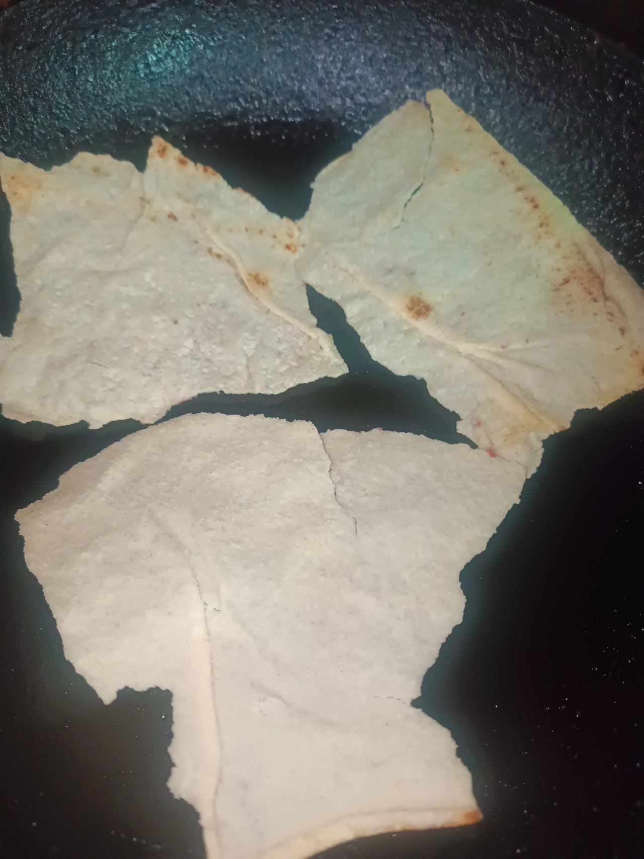 Tomó algunos trozos de pan árabe y los llevó a la cocina para que se pongan duros como una galleta y así disfrutarlos mejor